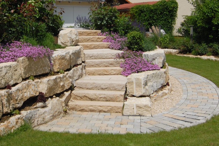 Mit Stufen und Treppen aus Natursteinen strukturieren wir Ihren Garten in Hanglage oder den Zugang zu Ihrem Haus. Stufen müssen nicht nur praktisch sein, sondern erzeugen auch gleichzeitig eine ansprechende Optik.